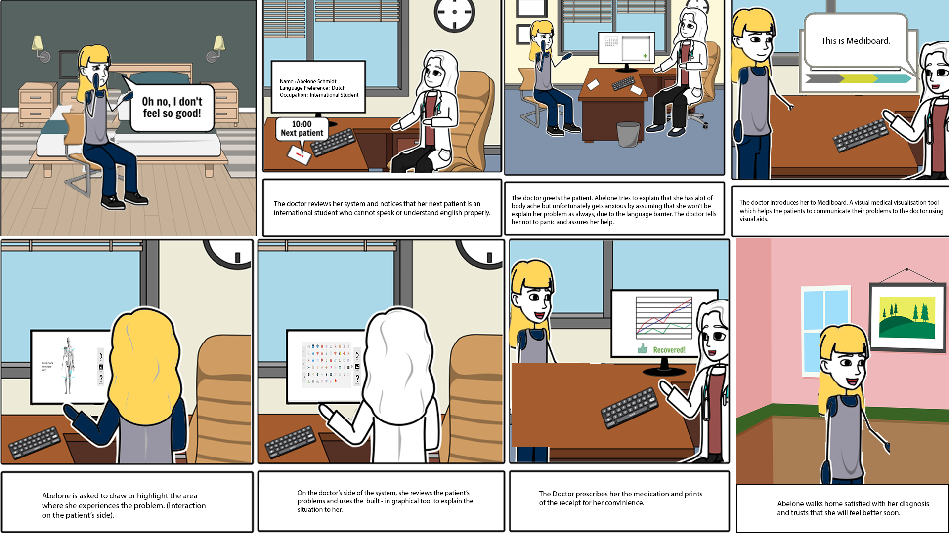 Storyboarding utilises the power of comics in order to explain certain concepts and the interactions between people and the service provided, MediBoard notably our user, Abilone from the persona method was utilised.